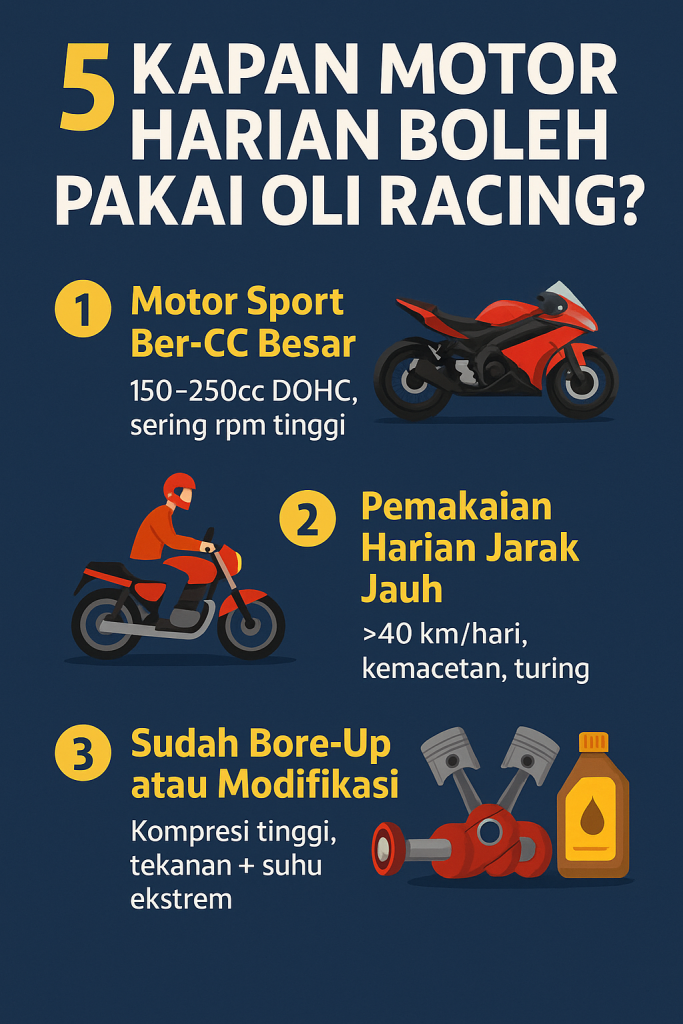 Oli racing identik dengan dunia balap, RPM tinggi, dan suhu ekstrem. Namun belakangan ini, tren menggunakan oli racing untuk motor hari...