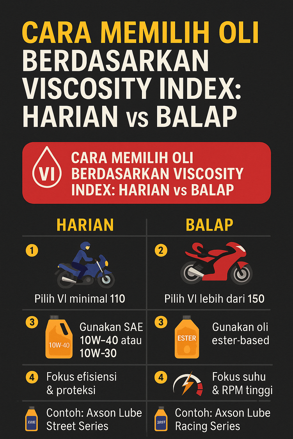 Axson Lube Racing Series adalah salah satu contoh oli dengan VI tinggi (160+) yang cocok untuk kebutuhan performa balap hingga sport touring berat.