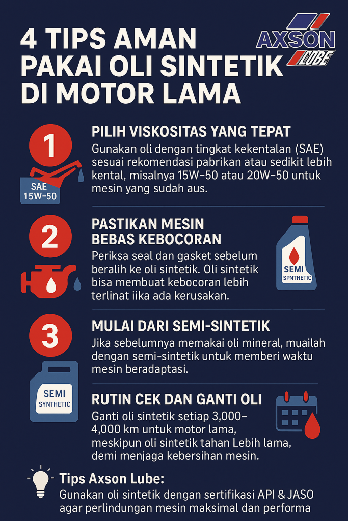 10 Agu Oli Motor Matic vs Manual, Tak Berkategori Oli Motor: Apakah Oli Sintetik Aman untuk Motor Lama? 10 Agustus 2025 By adminaxsonlube 0 comments Facebook Twitter Pinterest linkedin Telegram Di kalangan pemilik motor lama, topik penggunaan oli sintetik sering memicu perdebatan. Ada yang menganggap oli sintetik justru membuat...Continue reading