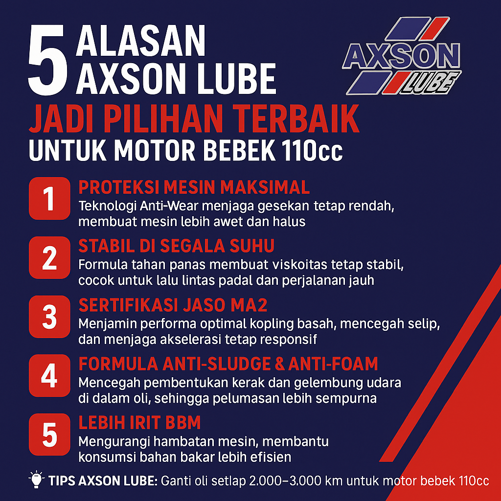 11 Agu Oli Motor Oli Terbaik untuk Motor Bebek 110cc: Panduan Memilih Pelumas yang Tepat 11 Agustus 2025 By adminaxsonlube 0 comments Facebook Twitter Pinterest linkedin Telegram Motor bebek 110cc adalah tulang punggung mobilitas di Indonesia. Dari pelajar, pekerja kantoran, hingga pedagang, motor bebek menjadi p...Continue reading