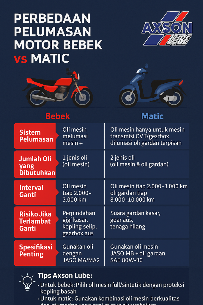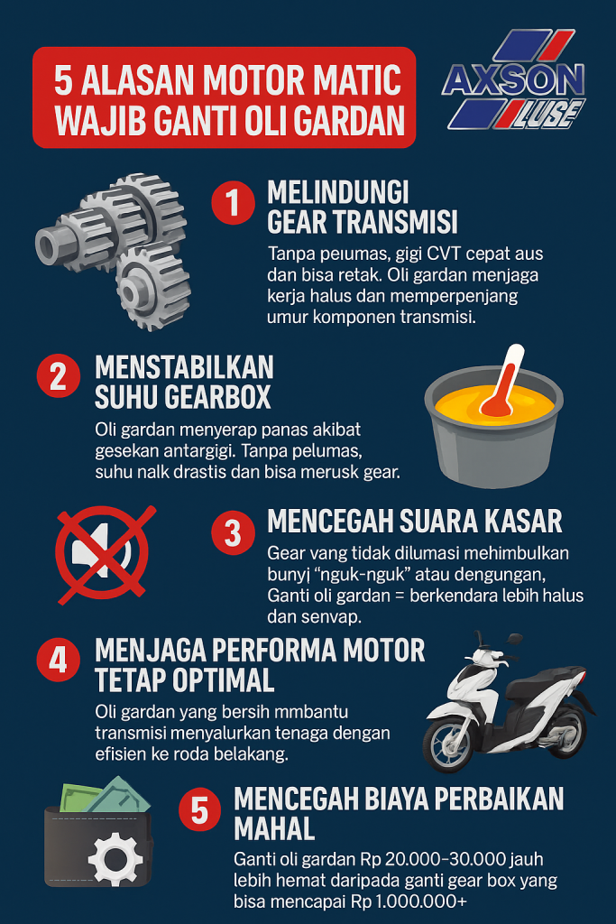 07 Agu Oli Motor Matic vs Manual Kenapa Motor Matic Butuh Oli Gardan? Panduan Lengkap Fungsi, Perawatan, dan Risiko Jika Diabaikan 7 Agustus 2025 By adminaxsonlube 0 comments Facebook Twitter Pinterest linkedin Telegram Motor matic telah menjadi pilihan utama masyarakat Indonesia karena kemudahannya dalam berkendara. Tapi masih banyak pemilik motor mati...Continue reading