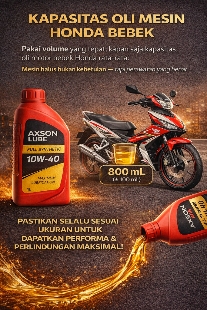 27 Des Oli Motor Honda Bebek Kapasitas Oli Mesin Honda Bebek (Lengkap Semua Tipe) 27 Desember 2025 By adminaxsonlube 0 comments Facebook Twitter Pinterest linkedin Telegram Supra X, Revo, Blade, dan Model Lain: Panduan Akurat agar Mesin Tetap Awet Motor bebek Honda sudah lama dikenal sebagai tulang...Continue reading
