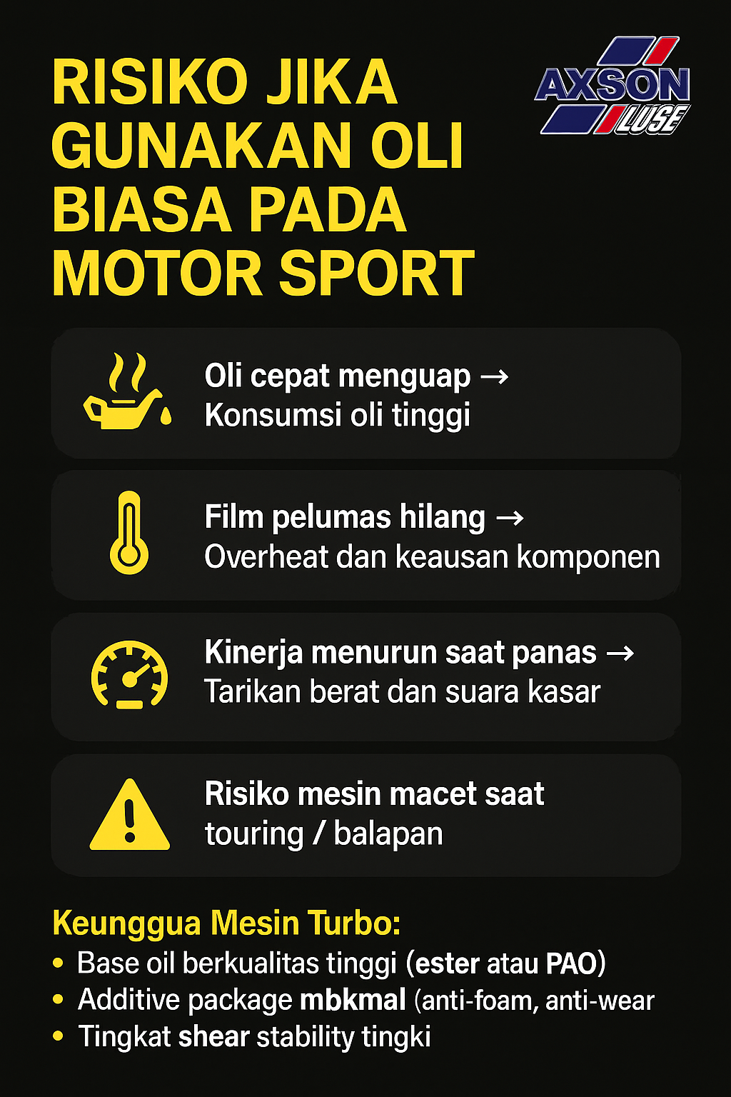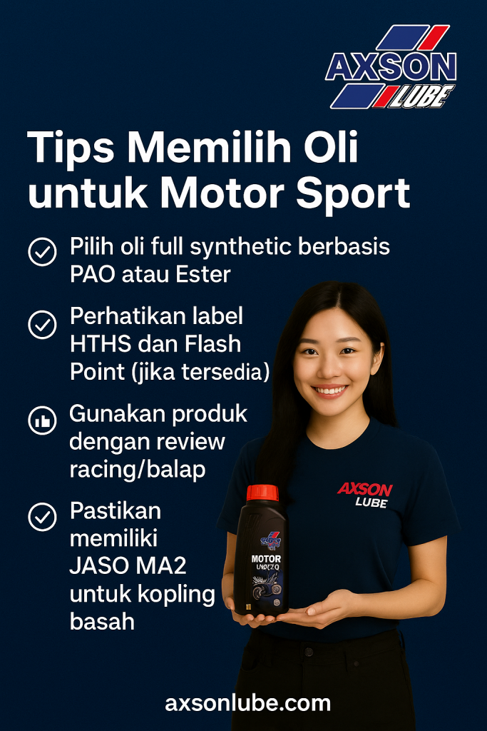 Motor sport membutuhkan pelumas yang mampu mengimbangi performanya. Stabilitas termal tinggi adalah fitur penting yang memastikan oli tetap menjaga mesin dalam suhu ekstrem dan RPM tinggi. Jika Anda pengendara motor sport—baik untuk hobi, touring, atau balap—menggunakan oli berkualitas tinggi seperti Motul 300V, Axson Lube Racing, atau Liqui Moly Race Tech adalah investasi untuk daya tahan dan keselamatan mesin Anda.