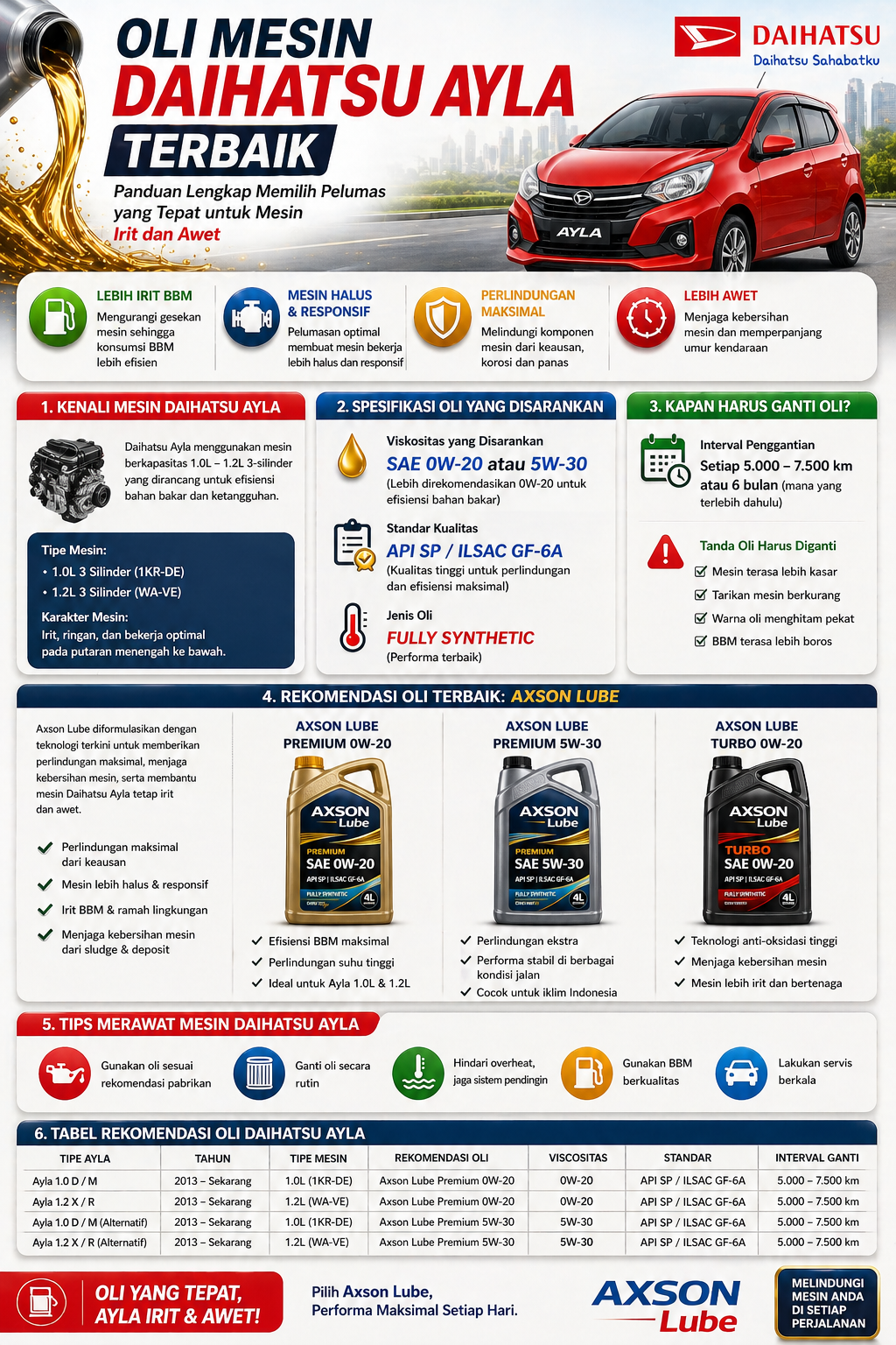 Artikel ini membahas oli mesin Daihatsu Ayla, pilihan viskositas terbaik, waktu ganti oli, rekomendasi produk, dan Rekomendasi Axon Lube Oli Mobil Daihatsu Ayla.
