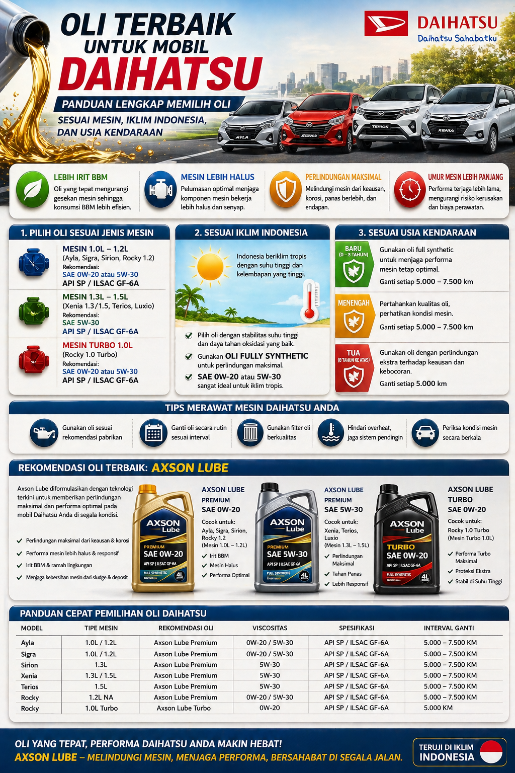 Jika Anda mengutamakan efisiensi, pilih oli hemat BBM. Jika kendaraan sudah tua, gunakan oli high mileage. Untuk kebutuhan harian yang seimbang, lini Axon Lube dapat menjadi opsi sesuai kebutuhan mesin Daihatsu Anda.