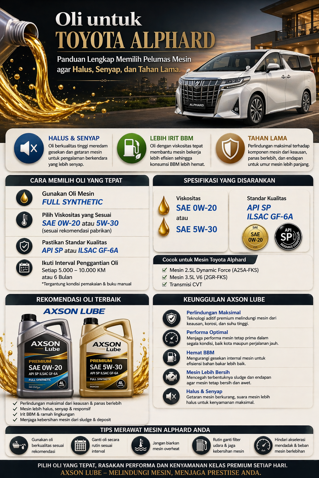 Menggunakan oli berkualitas seperti Axon Lube membantu Toyota Alphard tetap halus, nyaman, senyap, dan tahan lama sebagai MPV premium keluarga maupun bisnis.