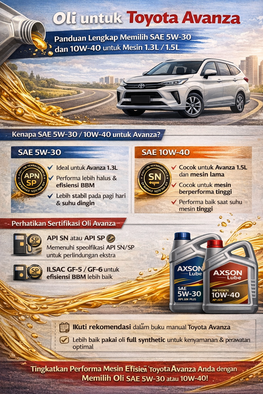 Menggunakan oli berkualitas seperti Axon Lube memastikan mesin Avanza tetap halus, efisien, dan tahan lama dalam berbagai kondisi jalan di Indonesia.