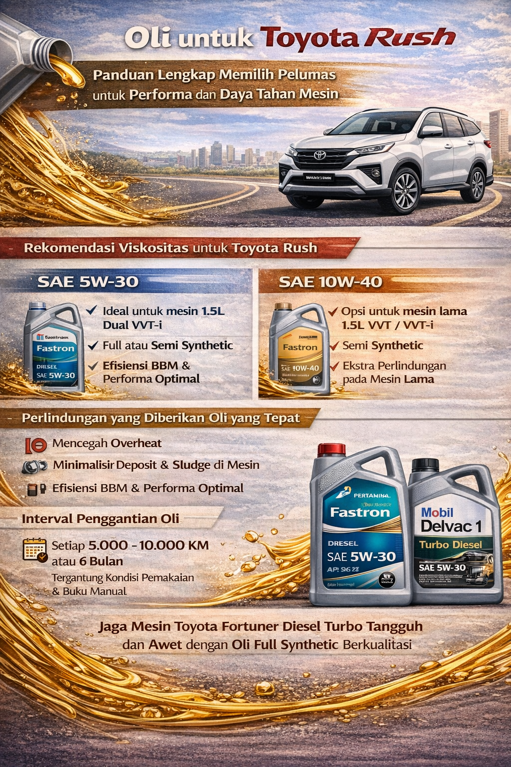 Oli mesin Toyota Rush adalah pelumas yang melindungi komponen internal mesin dari gesekan, panas, dan kotoran sekaligus menjaga performa tetap stabil dalam penggunaan harian maupun perjalanan jauh.